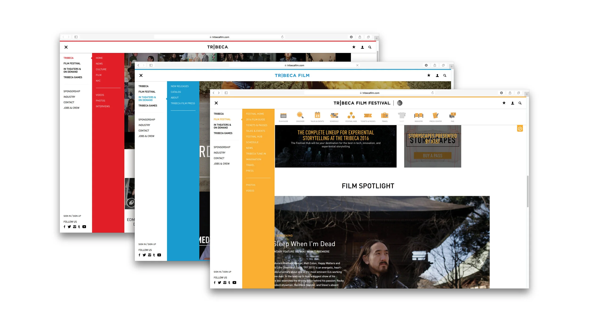 The marketing theme came into the venues themselves with our environmental signage, installations, publications, and festival guides. We also refreshed the tribecafilm.com website for easy usability across Tribeca Enterprise’s several constituent organizations (4.4).