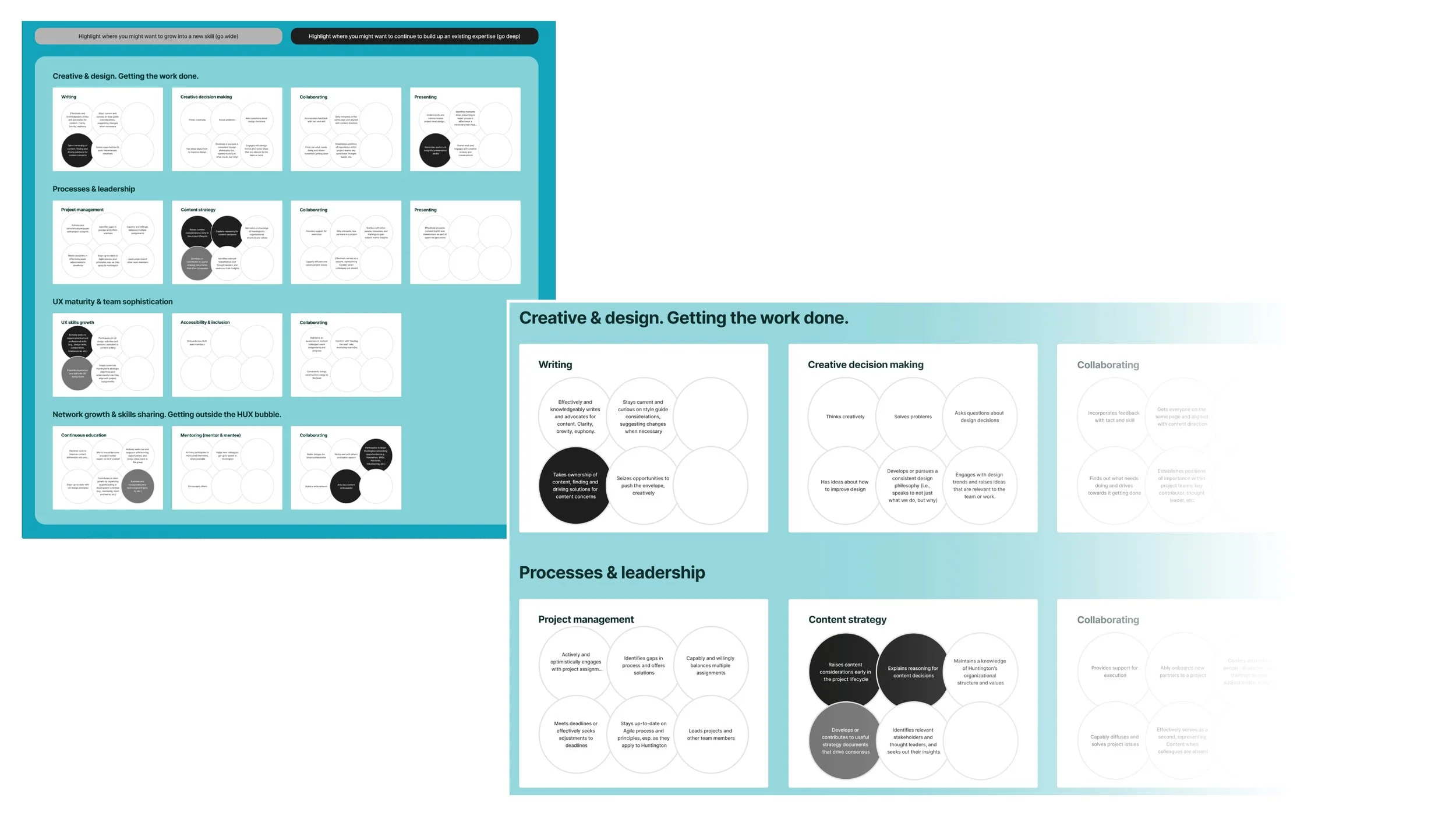 Importantly, growing a more mature, expansive design practice includes transparency and my own clear-headedness as a manager. As colleagues sought more detailed guidance in their career trajectory, I built up my administrative skillset and the tools I used to help set expecations and ensure individual career ambitious were on track. Among those purpose-built tools was a UX Content Designer Skills Map, to better facilitate development conversations.